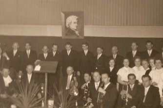 Kirchenchor im Mozartjahr 1956 im Saal           ...im Vordergrund Chorleiter, Organist und